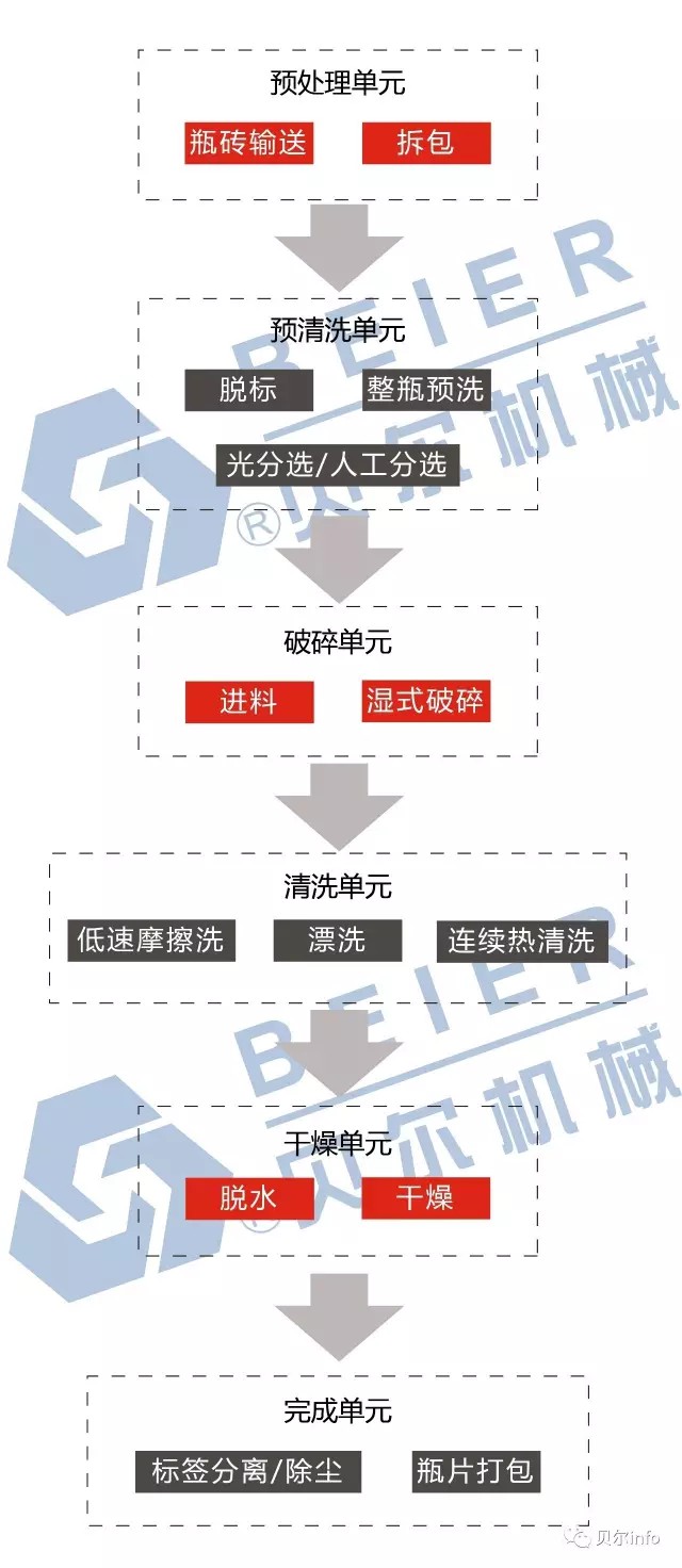 回收的PET塑料瓶,首先經(jīng)過(guò)"脫標(biāo)機(jī)"去除瓶身的標(biāo)簽,然后經(jīng)過(guò)"平面分選輸送機(jī)",在此步驟挑選出物料中的雜色瓶(如綠色瓶、藍(lán)色瓶、殘余雜質(zhì)等),再進(jìn)入"破碎機(jī)"進(jìn)行粉碎,出來(lái)后進(jìn)入"漂洗水槽"進(jìn)行分離(實(shí)現(xiàn)PET瓶片與PP標(biāo)簽紙、瓶蓋的分離),分離干凈后進(jìn)入"熱清洗單元"進(jìn)行加熱清洗,出來(lái)后再進(jìn)入"漂洗水槽"進(jìn)行漂洗(去除高溫加熱中的清洗劑),最后進(jìn)入"脫水機(jī)"脫水后直接裝包。針對(duì)產(chǎn)量大、瓶片級(jí)別高我們可通過(guò)整瓶預(yù)洗環(huán)節(jié)、脫標(biāo)分揀環(huán)節(jié)、初碎環(huán)節(jié)、初洗分離環(huán)節(jié)、高溫清洗環(huán)節(jié)、中和清洗環(huán)節(jié)、漂洗干燥環(huán)節(jié)、瓶片精選環(huán)節(jié)等整套精洗環(huán)節(jié)來(lái)達(dá)到高精凈片。此流程為常規(guī)流程,亦可根據(jù)客戶(hù)需要設(shè)計(jì)不同生產(chǎn)解決方案。