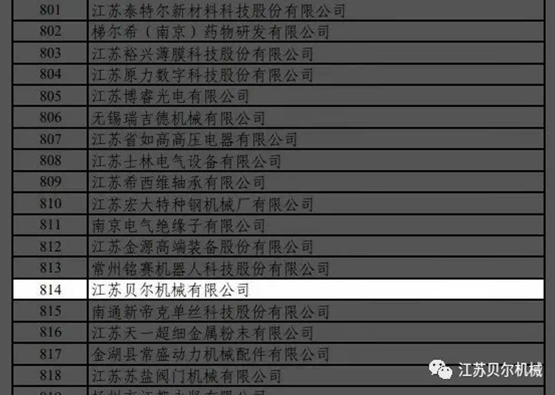 2021年7月19日,中國工業和信息化部公示了第三批專精特新“小巨人”企業名單,江蘇貝爾機械有限公司成功上榜。